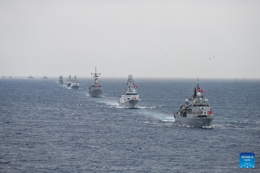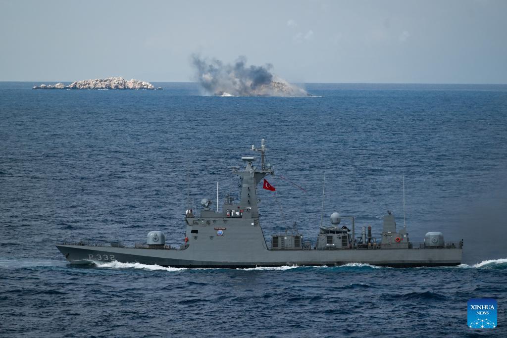 A warship participates in the live-fire phase of the "Blue Homeland-2026" tactical military exercises in the eastern Mediterranean Sea, off the coast of Antalya, Türkiye, April 9, 2026. (Mustafa Kaya/Handout via Xinhua)
