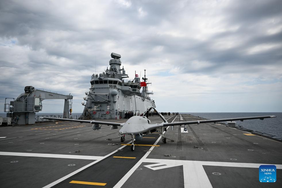 This photo taken on April 9, 2026 shows a Bayraktar TB3 drone, a Turkish carrier-based medium-altitude long-endurance unmanned combat aerial vehicle, during the "Blue Homeland-2026" tactical military exercises in the eastern Mediterranean Sea, off the coast of Antalya, Türkiye. (Mustafa Kaya/Handout via Xinhua)