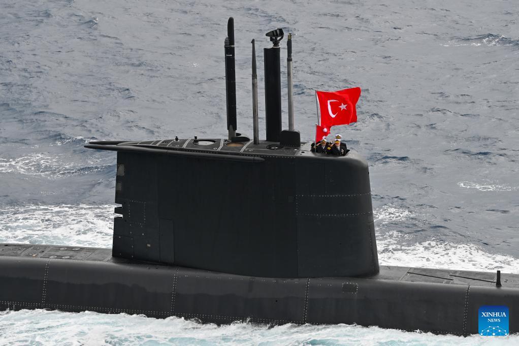 A submarine participates in the "Blue Homeland-2026" tactical military exercises in the eastern Mediterranean Sea, off the coast of Antalya, Türkiye, April 9, 2026. (Mustafa Kaya/Handout via Xinhua)