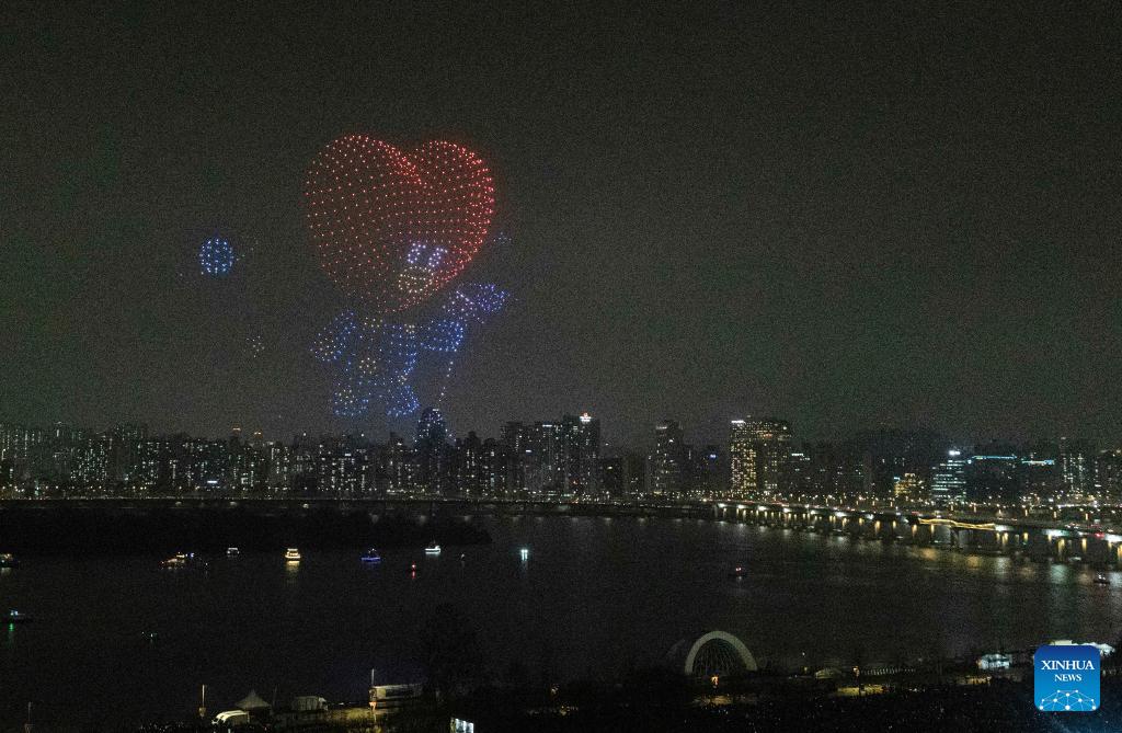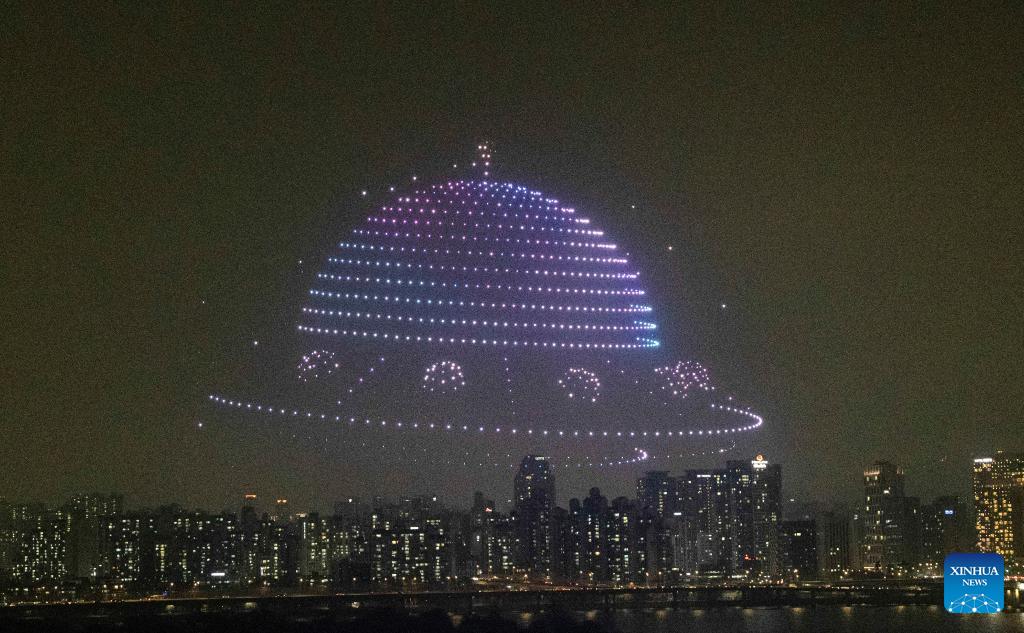A drone light show is staged at Yeouido park in Seoul, South Korea, April 10, 2026. (Photo by Jun Hyosang/Xinhua)