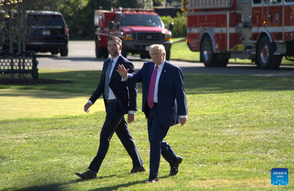 U.S. President Donald Trump (R) walks to board Marine One at the White House in Washington, D.C., the United States, on April 10, 2026. Trump said Friday U.S. negotiators will discuss the reopening of the Strait of Hormuz with the Iranians in Pakistan on Saturday, asserting the crucial global energy waterway will reopen soon and "automatically," with or without Iran's cooperation. Trump said his main focus in a deal with Iran was ensuring that Tehran cannot obtain a nuclear weapon. (Photo by Li Yuanqing/Xinhua)