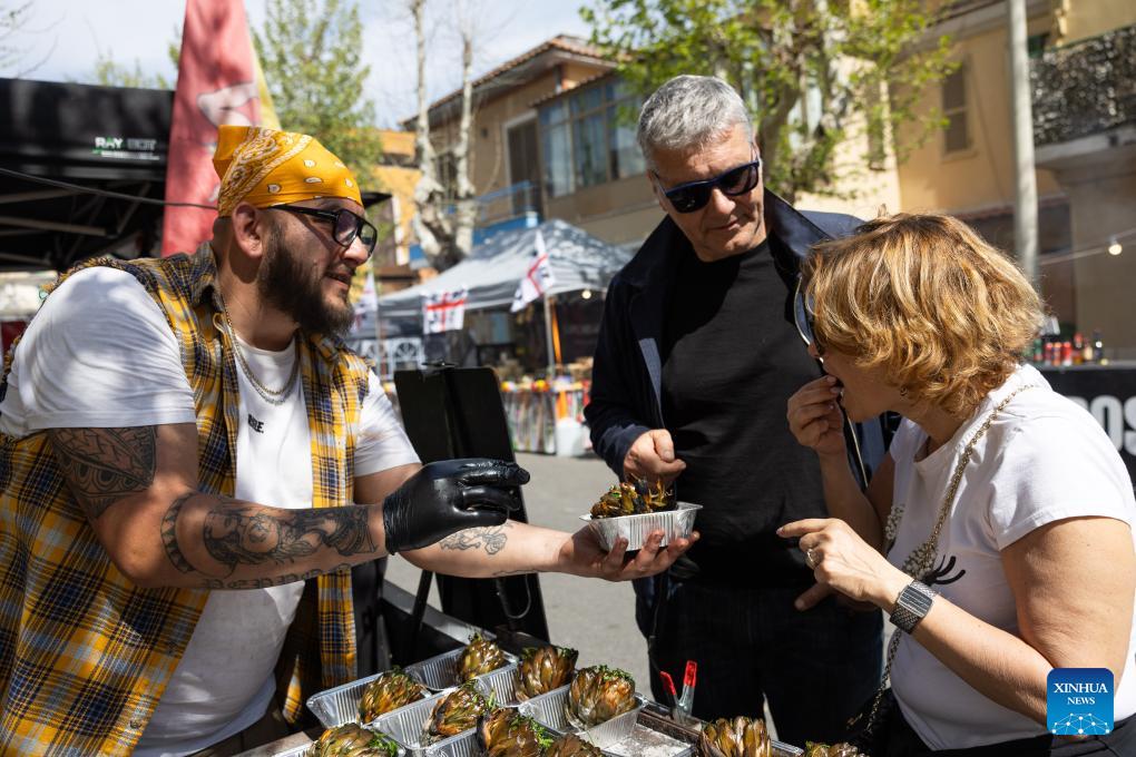 People taste artichoke snacks during a Roman artichoke festival in Ladispoli, Italy, April 10, 2026. The annual festival celebrating the harvest of the Roman artichoke kicked off on Friday. (Xinhua/Li Jing)