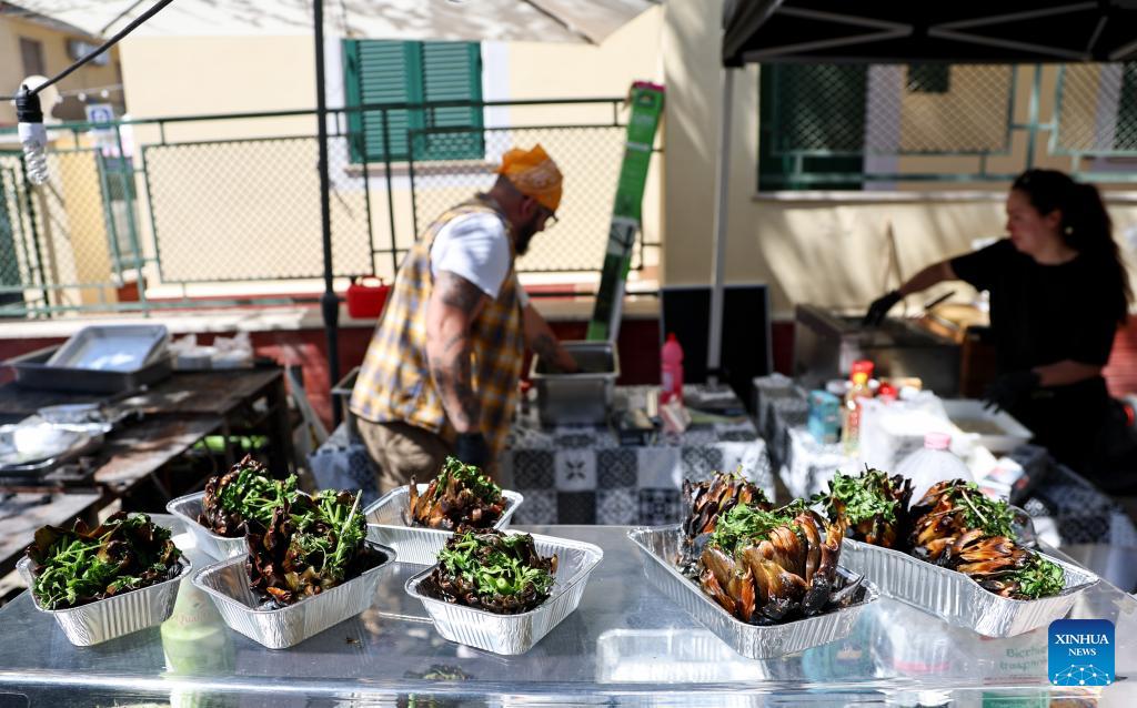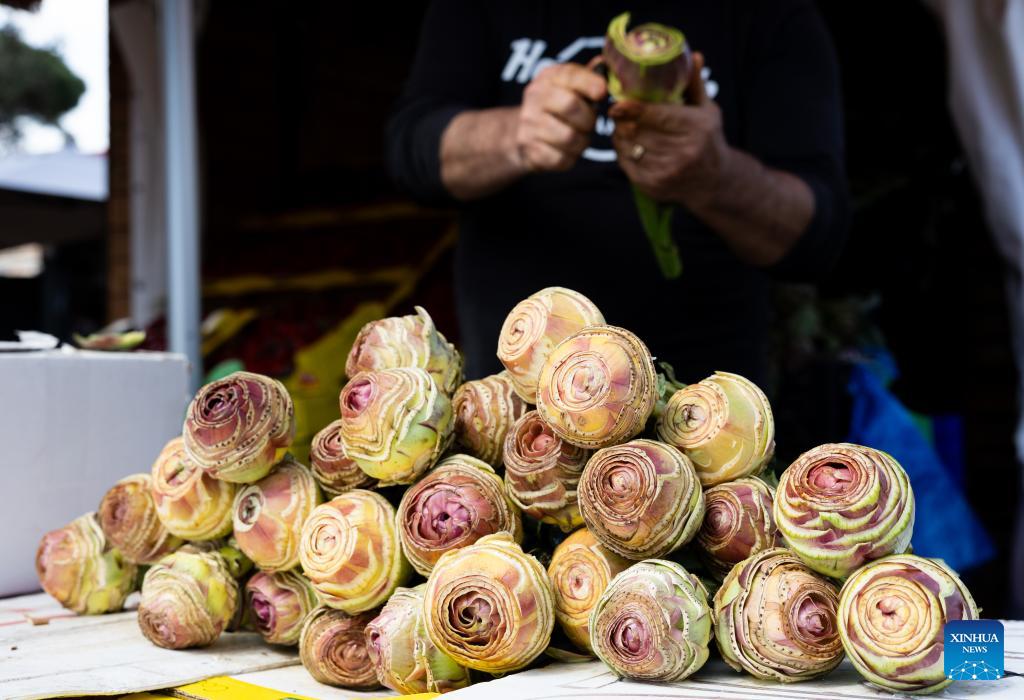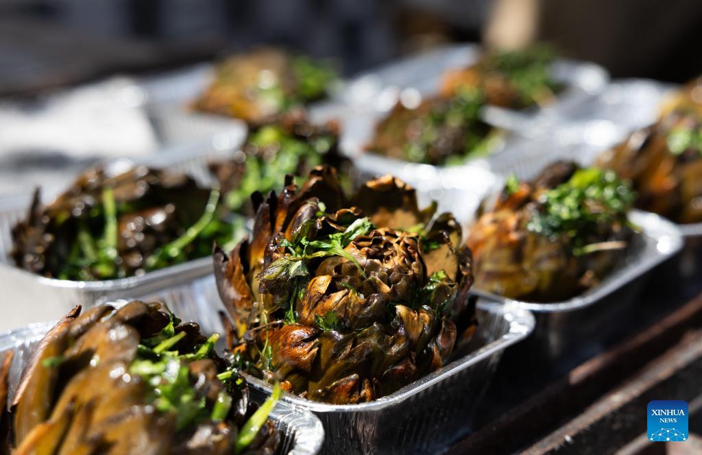 Artichokes are pictured during a Roman artichoke festival in Ladispoli, Italy, April 10, 2026. The annual festival celebrating the harvest of the Roman artichoke kicked off on Friday. (Xinhua/Wang Kaiyan)