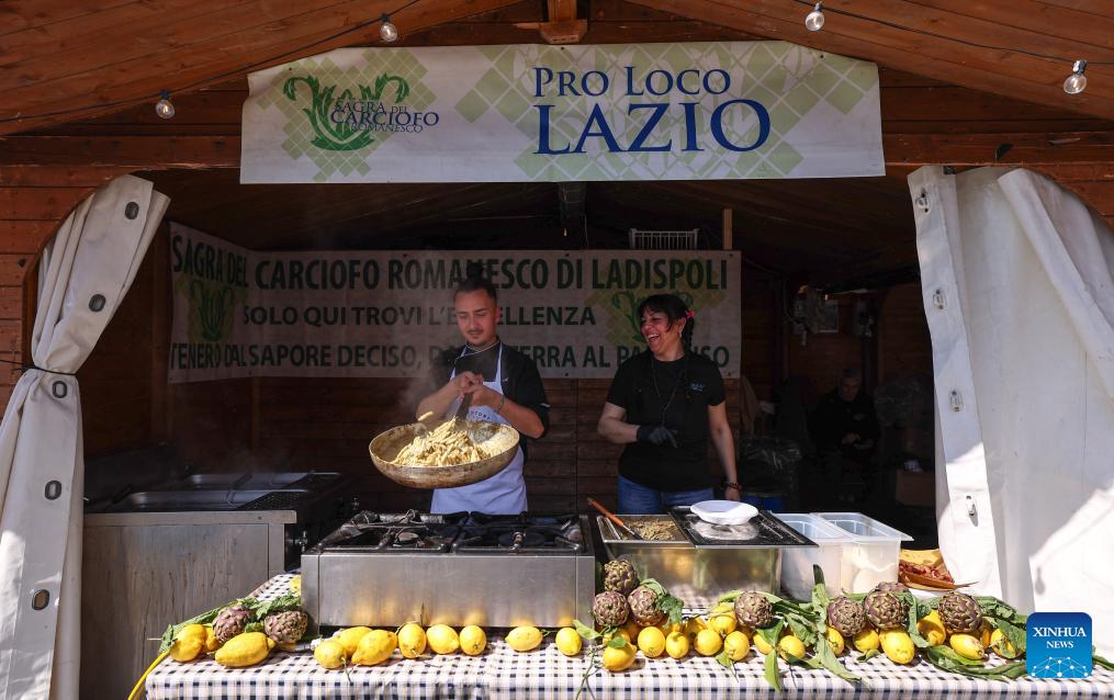 A chef prepares artichoke food during a Roman artichoke festival in Ladispoli, Italy, April 10, 2026. The annual festival celebrating the harvest of the Roman artichoke kicked off on Friday. (Xinhua/Wang Kaiyan)