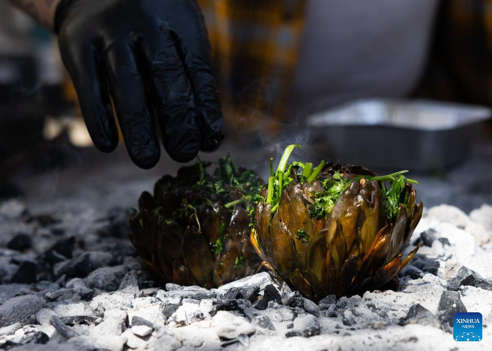 A vendor grills artichokes over charcoal during a Roman artichoke festival in Ladispoli, Italy, April 10, 2026. The annual festival celebrating the harvest of the Roman artichoke kicked off on Friday. (Xinhua/Li Jing)