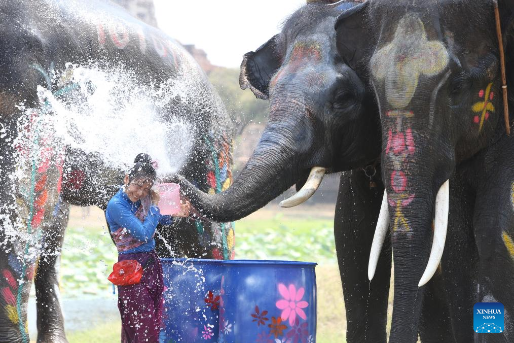 A woman interacts with an elephant during a water splashing event in celebration of the upcoming Songkran festival in Ayutthaya, Thailand, April 10, 2026. (Photo: Xinhua)