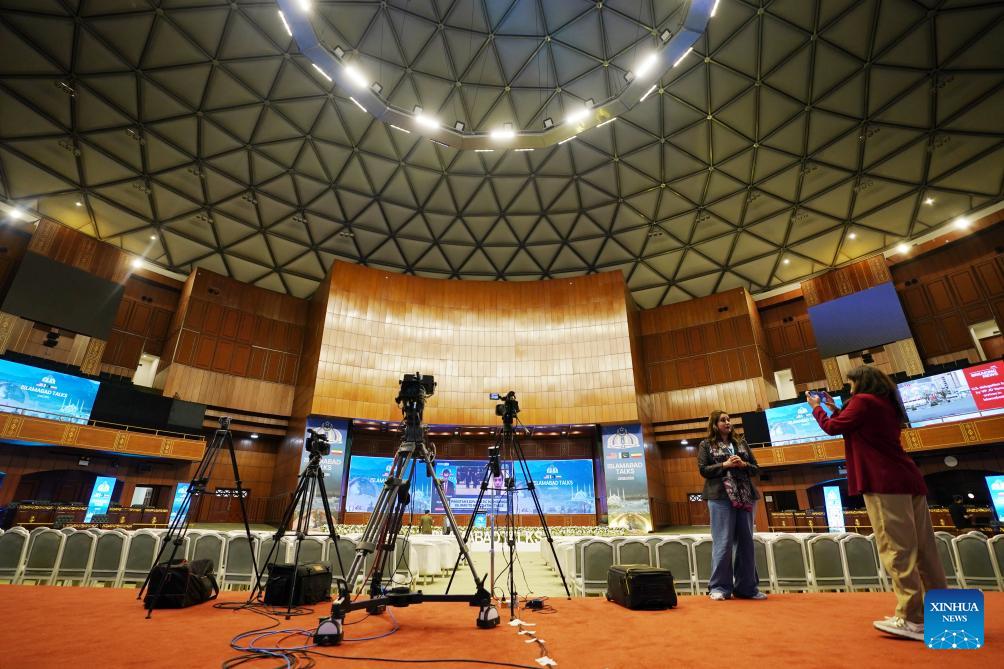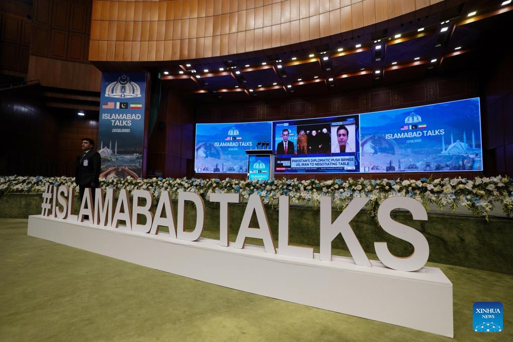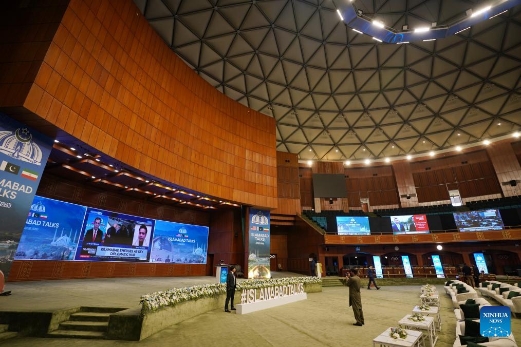 This photo taken on April 11, 2026 shows an interior view of the press center for the talks between the United States and Iran in Islamabad, Pakistan. The United States and Iran are expected to have a negotiation in Islamabad to end recent hostilities in the Middle East. (Photo: Xinhua)