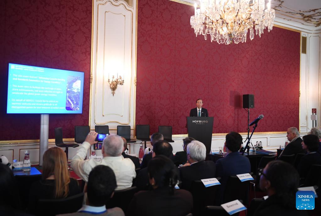 The Global Energy Interconnection Development and Cooperation Organization (GEIDCO) Chairman Xin Baoan speaks at a side event of the International Vienna Energy and Climate Forum in Vienna, Austria, April 9, 2026.(Photo: Xinhua)