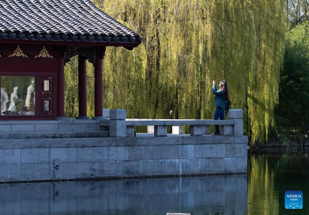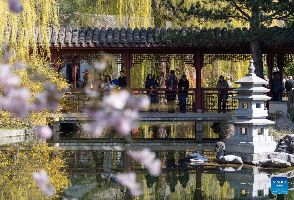 People visit the Chinese Garden during the Cherry Blossom Festival at the Gardens of the World in Berlin, Germany, April 11, 2026. Around 25,000 visitors are expected to participate in the 18th Cherry Blossom Festival. (Xinhua/Zhang Haofu)
