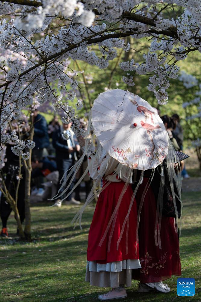 People enjoy themselves under cherry blossoms during the Cherry Blossom Festival at the Gardens of the World in Berlin, Germany, April 11, 2026. Around 25,000 visitors are expected to participate in the 18th Cherry Blossom Festival. (Xinhua/Zhang Haofu)