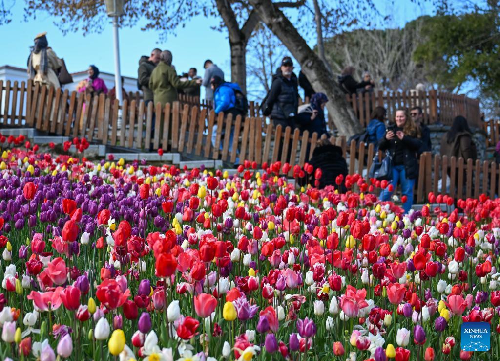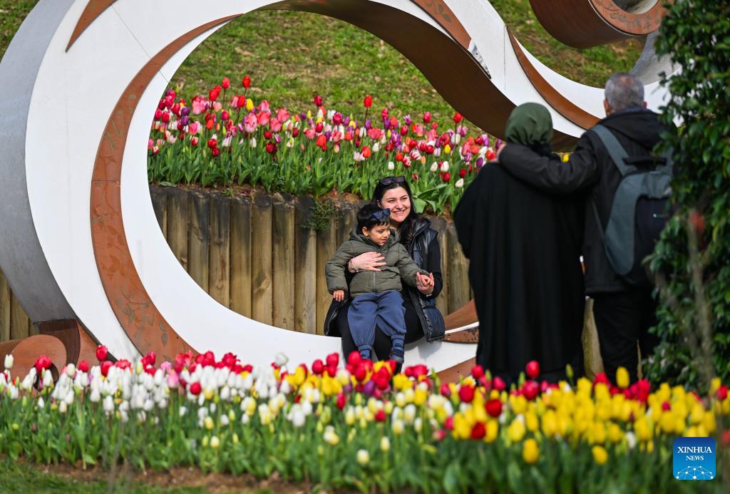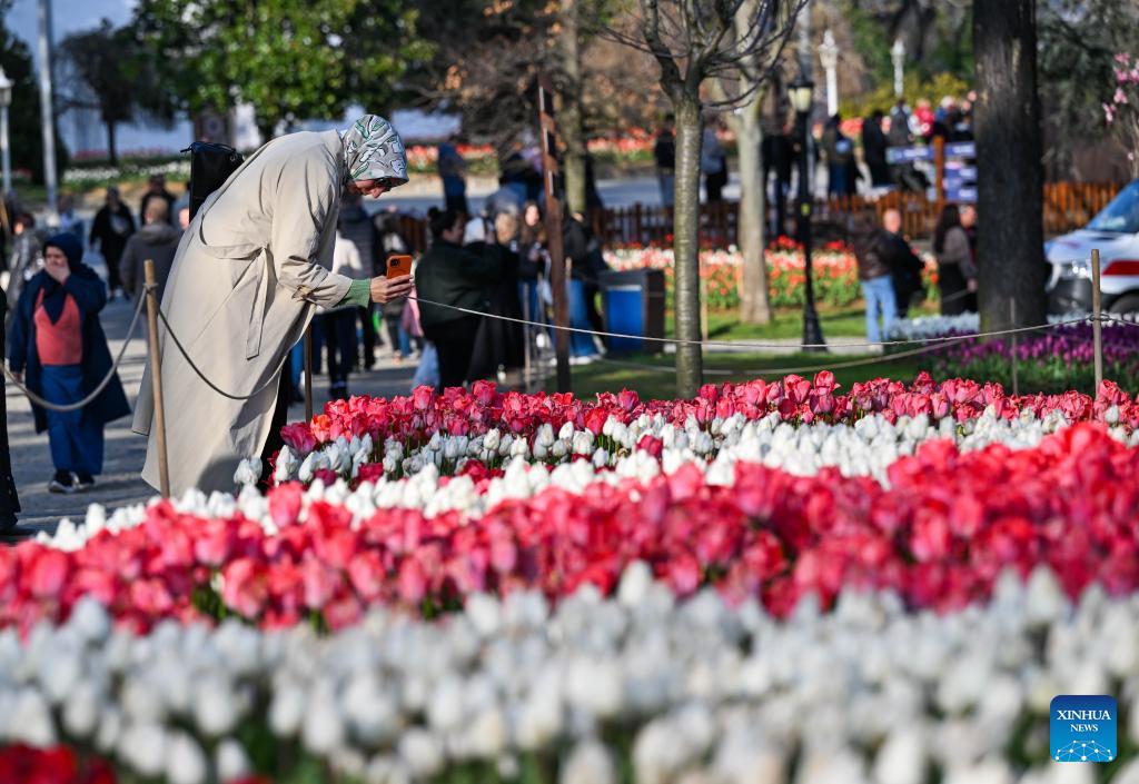 Tourists take photos at Emirgan Park in Istanbul, Türkiye, on April 11, 2026. The annual Tulip Festival is held here in April. (Xinhua/Liu Lei)