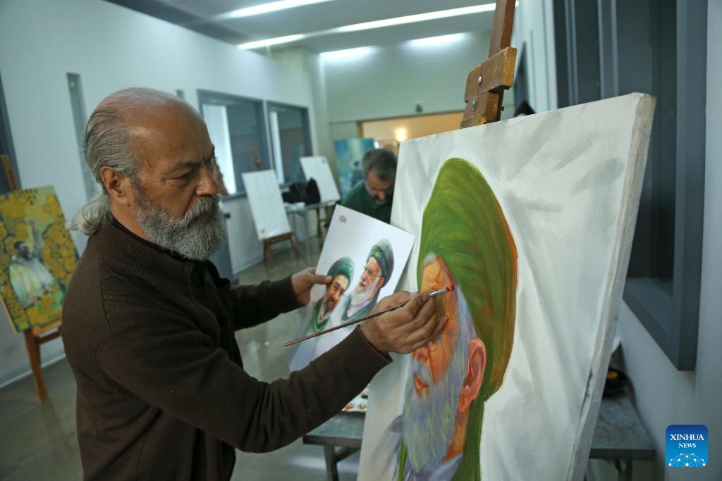 A painter creates a portrait during an activity held to mourn the death of Iran's late Supreme Leader Ali Khamenei in Tehran, Iran, April 12, 2026. (Xinhua/Shadati)