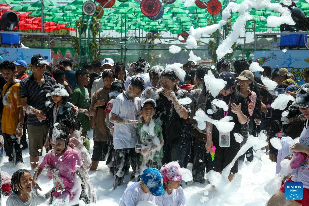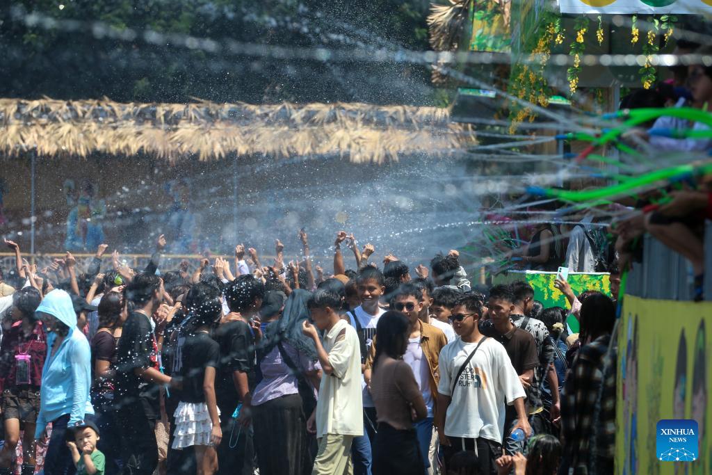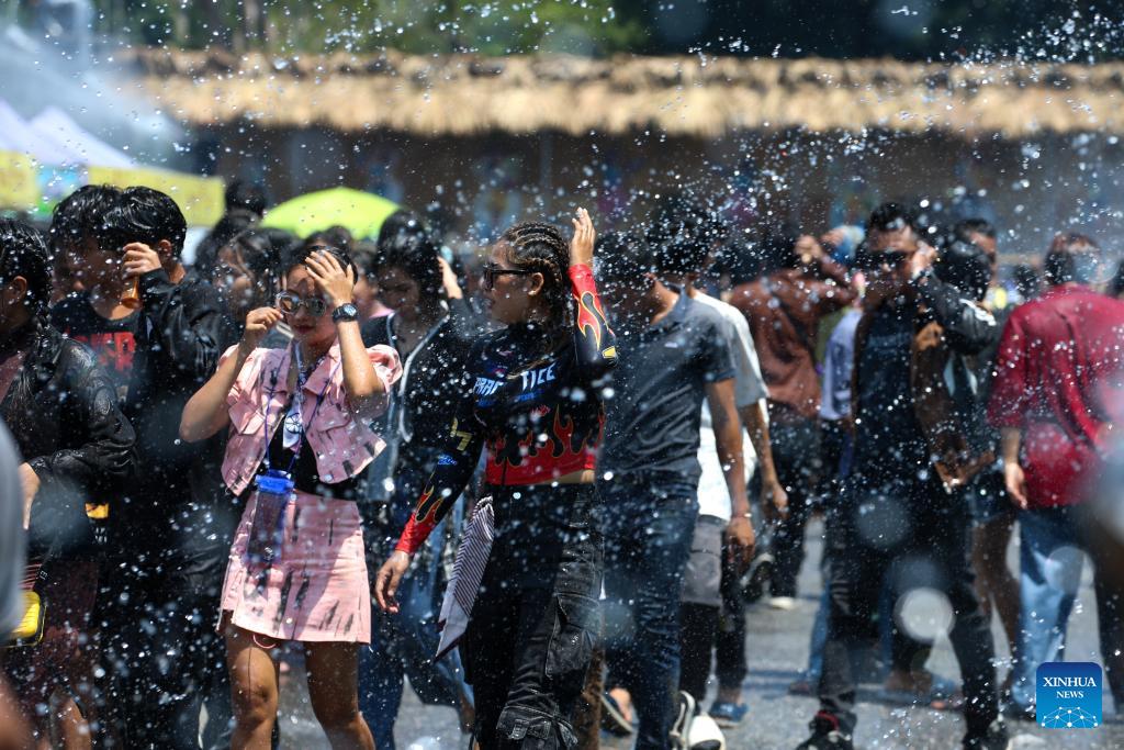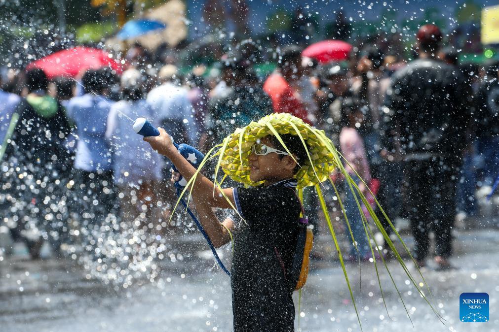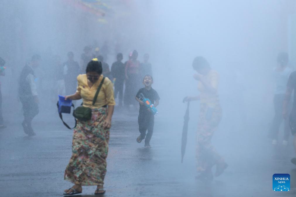 People take part in celebrations of the Thingyan water festival in Yangon, Myanmar, April 13, 2026. The Thingyan water festival is a popular celebration in Myanmar, marking the Myanmar New Year and lasting 4 to 5 days. This year's festival started from April 13. (Xinhua/Myo Kyaw Soe)
