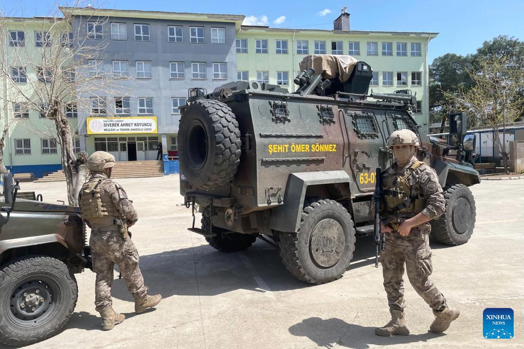 Local police deploy armored vehicles to reinforce the Ahmet Koyuncu Vocational and Technical Anatolian High School's security following the shooting incident at the school in the Siverek district, southeast Türkiye's Sanliurfa province, on April 14, 2026. At least 16 people, mostly students, were injured in a school shooting in southeast Türkiye on Tuesday as a former student entered with a shotgun and opened fire randomly before committing suicide, local media reported. (Mustafa Kaya/Handout via Xinhua)