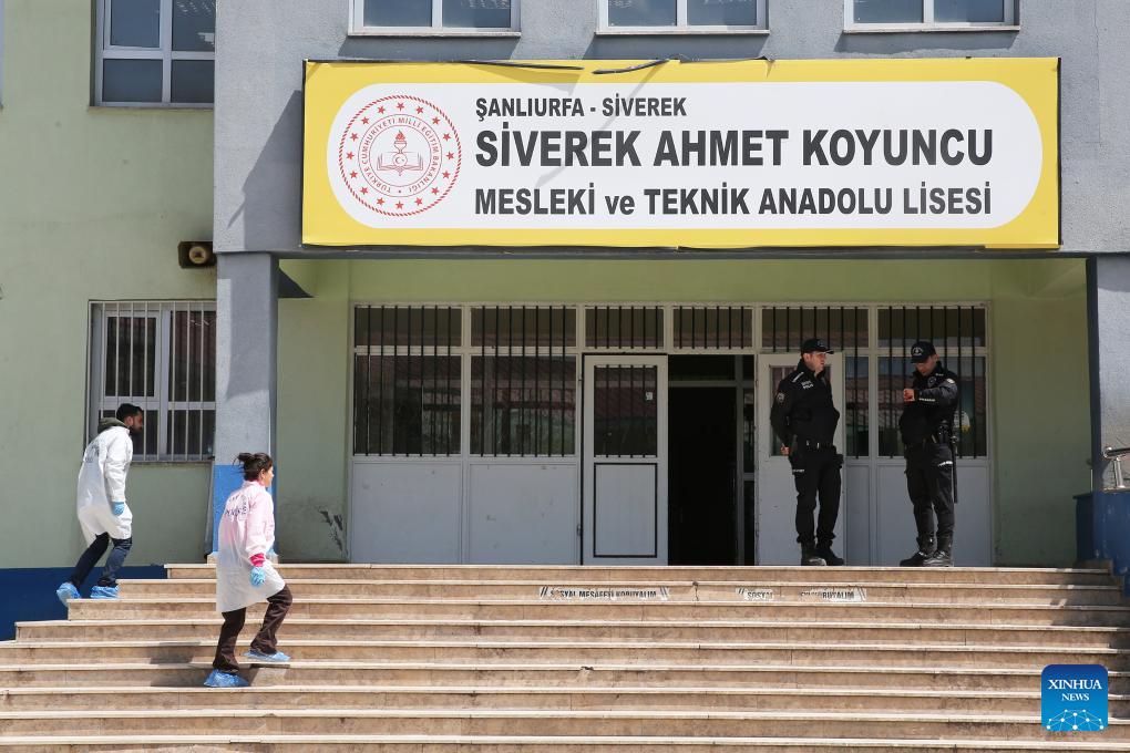 Police technicians conduct an on-site investigation following the shooting incident at the Ahmet Koyuncu Vocational and Technical Anatolian High School in the Siverek district, southeast Türkiye's Sanliurfa province, on April 14, 2026. (Photo: Xinhua)