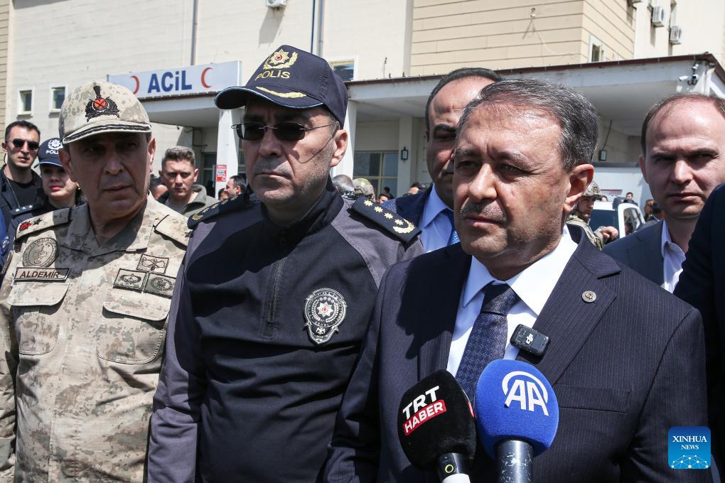 Sanliurfa Governor Hasan Sildak (front R) holds a press conference following the shooting incident at the Ahmet Koyuncu Vocational and Technical Anatolian High School in the Siverek district, southeast Türkiye's Sanliurfa province, on April 14, 2026. At least 16 people, mostly students, were injured in a school shooting in southeast Türkiye on Tuesday as a former student entered with a shotgun and opened fire randomly before committing suicide, local media reported. (Mustafa Kaya/Handout via Xinhua)