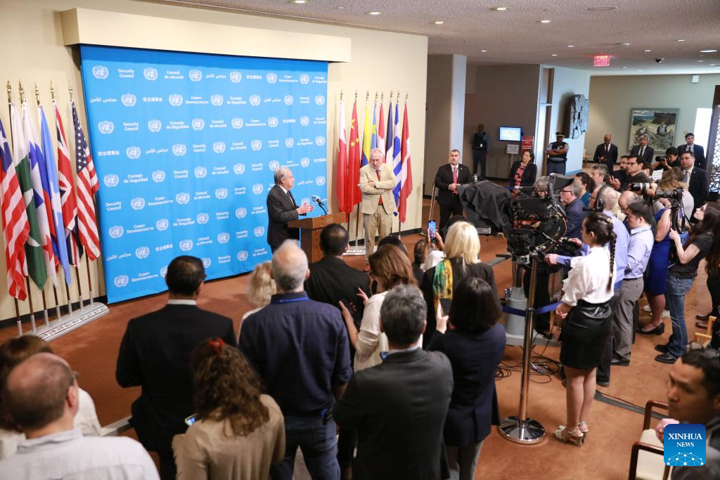 UN Secretary-General Antonio Guterres (at podium) speaks to the press at the UN headquarters in New York, April 14, 2026. Guterres said Tuesday that the resumption of talks between Washington and Tehran is highly probable. (Xinhua/Xie E)