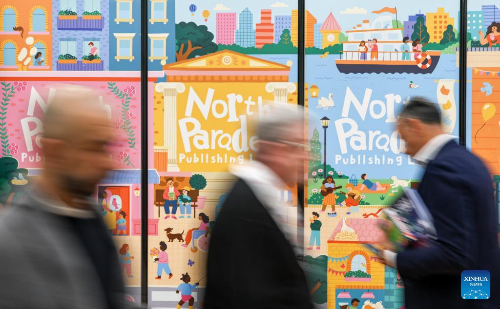 People walk past posters at the 63rd Bologna International Children's Book Fair in Bologna, Italy, April 13, 2026. Recognized as one of the world's largest and most influential children's book fairs, this year's edition, which runs from April 13 to 16, has drawn more than 1,500 exhibitors from over 90 countries and regions. (Xinhua/Wang Kaiyan)