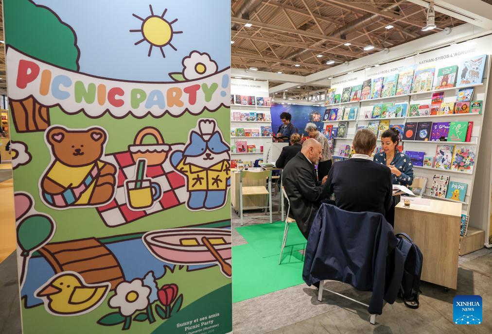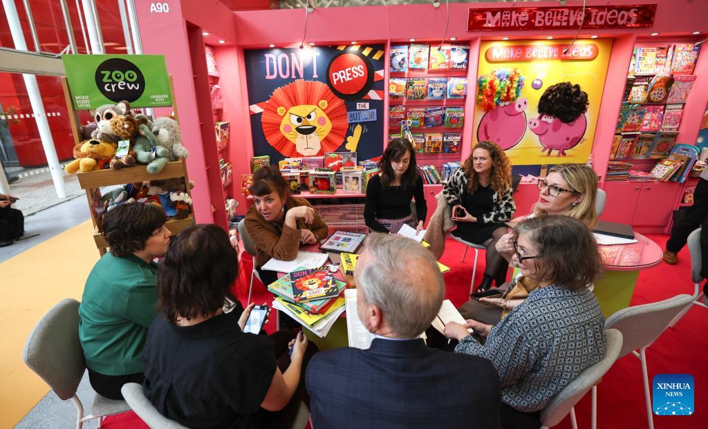 Exhibitors communicate at the 63rd Bologna International Children's Book Fair in Bologna, Italy, April 14, 2026. Recognized as one of the world's largest and most influential children's book fairs, this year's edition, which runs from April 13 to 16, has drawn more than 1,500 exhibitors from over 90 countries and regions. (Xinhua/Wang Kaiyan)