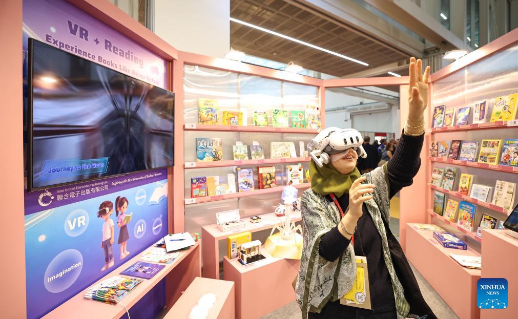 A woman tries virtual reality (VR) reading at the 63rd Bologna International Children's Book Fair in Bologna, Italy, April 14, 2026. Recognized as one of the world's largest and most influential children's book fairs, this year's edition, which runs from April 13 to 16, has drawn more than 1,500 exhibitors from over 90 countries and regions. (Xinhua/Wang Kaiyan)