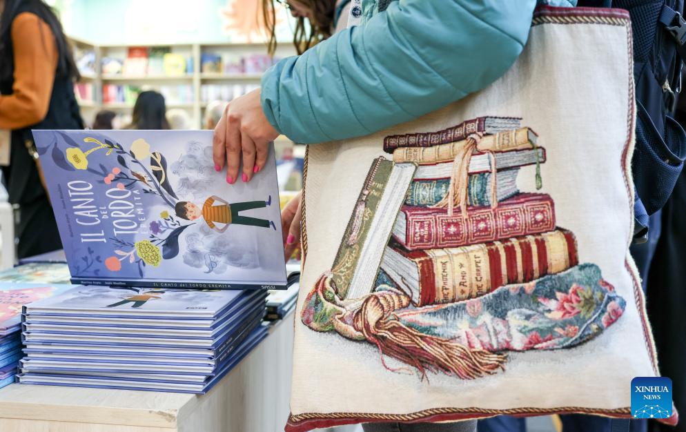 A visitor browses a book at the 63rd Bologna International Children's Book Fair in Bologna, Italy, April 14, 2026. Recognized as one of the world's largest and most influential children's book fairs, this year's edition, which runs from April 13 to 16, has drawn more than 1,500 exhibitors from over 90 countries and regions. (Xinhua/Wang Kaiyan)