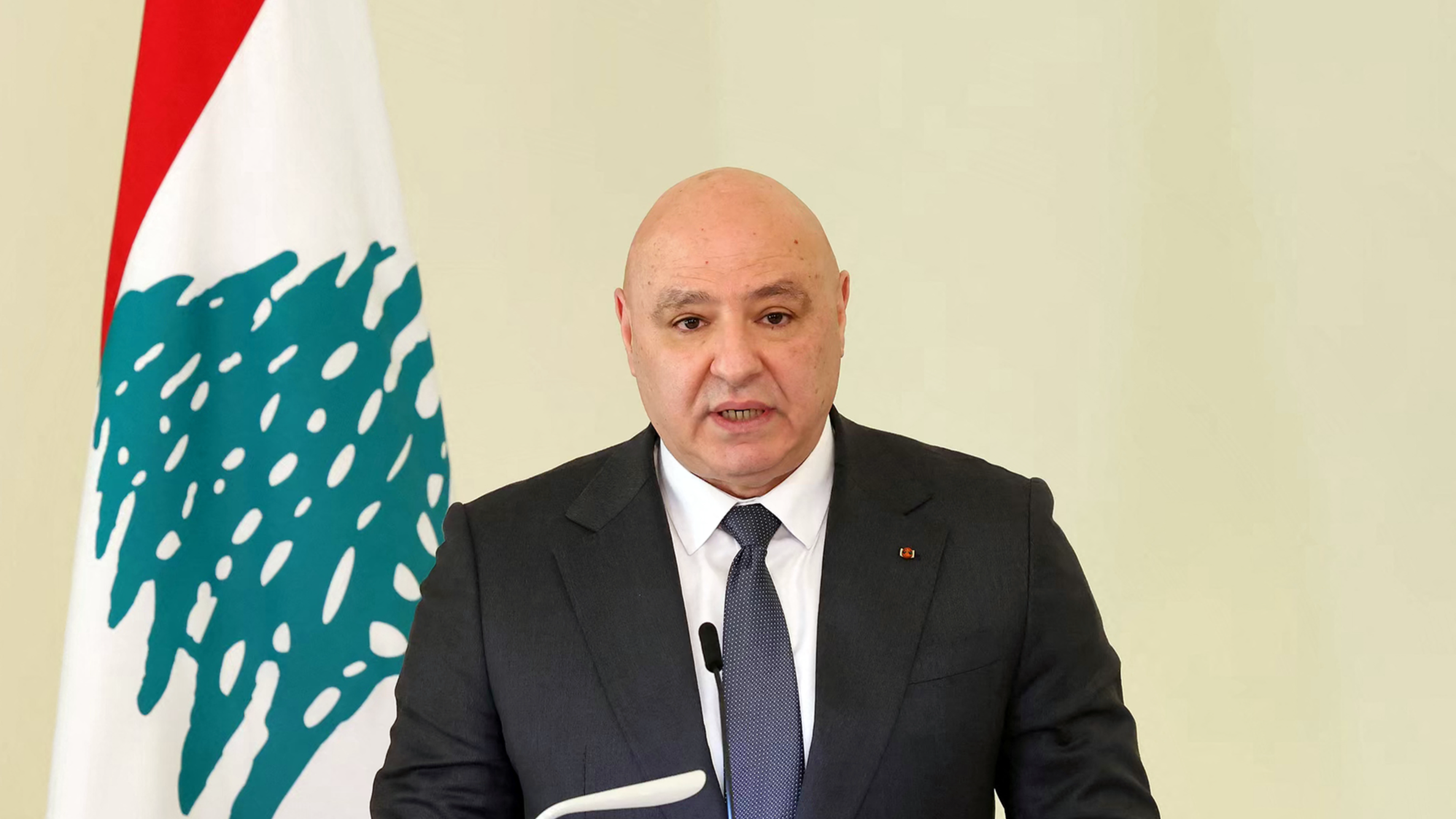 This handout photograph released by the Lebanese Presidency Press Office shows Lebanon's President Joseph Aoun speaking at a joint-press conference with Germany's president (not in the picture) at the Presidential Palace in Baabda, East of Beirut, Feb 16, 2026. (Photo: Xinhua)
