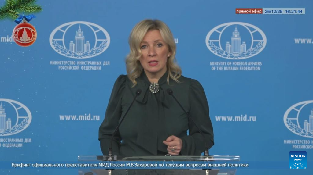 This video screenshot shows Russian Foreign Ministry Spokesperson Maria Zakharova speaking at a press briefing in Moscow, Russia, Dec. 25, 2025. (File photo: Xinhua)