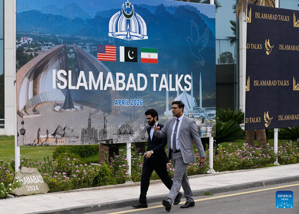 People walk past the press center for the talks between the United States and Iran in Islamabad, Pakistan, April 11, 2026. The United States and Iran are expected to have a negotiation in Islamabad to end recent hostilities in the Middle East. (File photo: Xinhua)