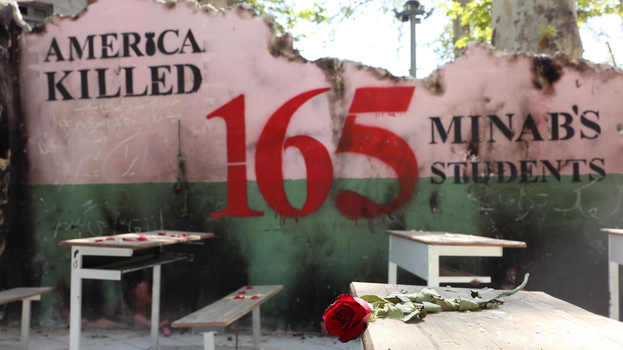 A flower is placed at a symbolic Minab school, referring to Minab School, which was targeted by a US air strike in which 165 schoolchildren and staff were killed, in northern Tehran, Iran, April 16, 2026. (Photo: VCG)