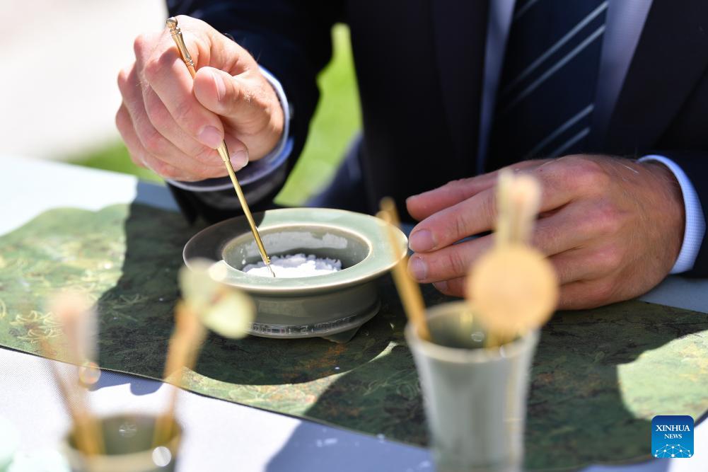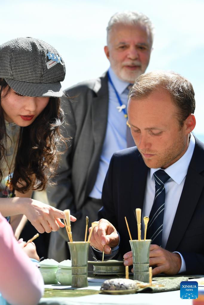 A participant tries Song Dynasty Seal Incense, a traditional incense-making technique, at the Palais des Nations in Geneva, Switzerland, April 17, 2026. A celebration marking the 2026 United Nations Chinese Language Day was held on Friday. The event drew some 400 participants, notably officials from international organizations and diplomats from over 30 countries such as Georgia, Laos, Mexico, Pakistan, Thailand, Uzbekistan, and Vietnam. (Xinhua/Lian Yi)
