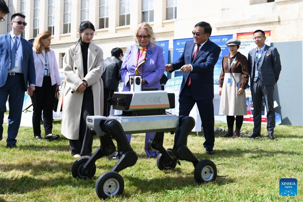 Tatiana Valovaya, director-general of the United Nations Office at Geneva, views a robot made in China at the Palais des Nations in Geneva, Switzerland, April 17, 2026. A celebration marking the 2026 United Nations Chinese Language Day was held on Friday. The event drew some 400 participants, notably officials from international organizations and diplomats from over 30 countries such as Georgia, Laos, Mexico, Pakistan, Thailand, Uzbekistan, and Vietnam. (Xinhua/Lian Yi)