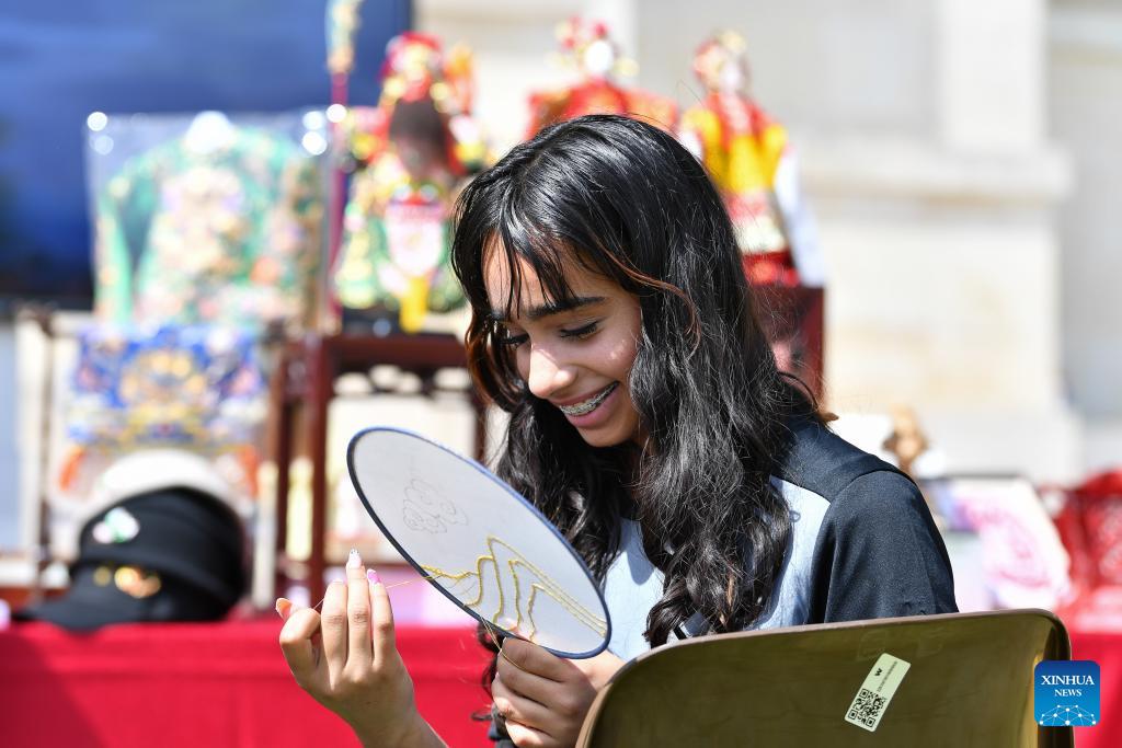 A child from Pakistan tries Quanzhou Jincang Embroidery, a traditional embroidery craft from southeast China's Fujian Province, at the Palais des Nations in Geneva, Switzerland, April 17, 2026. A celebration marking the 2026 United Nations Chinese Language Day was held on Friday. The event drew some 400 participants, notably officials from international organizations and diplomats from over 30 countries such as Georgia, Laos, Mexico, Pakistan, Thailand, Uzbekistan, and Vietnam. (Xinhua/Lian Yi)