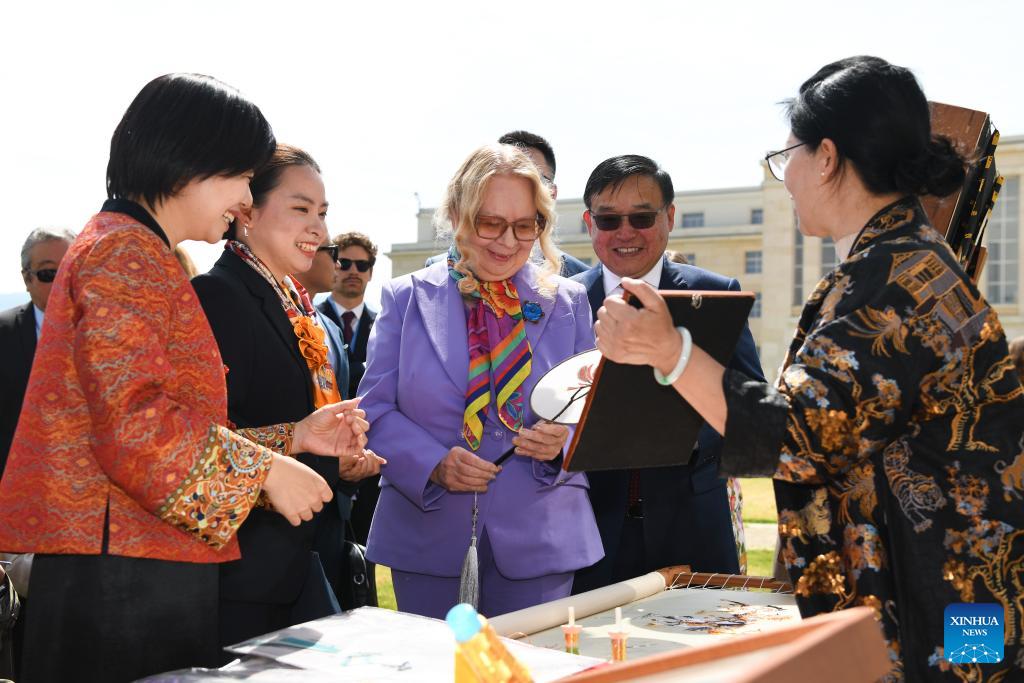 Tatiana Valovaya (C), director-general of the United Nations Office at Geneva, and Jia Guide (2nd L), China's permanent representative and ambassador to the United Nations Office at Geneva and other international organizations in Switzerland, view Quanzhou Jincang Embroidery, a traditional embroidery craft from southeast China's Fujian Province, at the Palais des Nations in Geneva, Switzerland, April 17, 2026. A celebration marking the 2026 United Nations Chinese Language Day was held on Friday. The event drew some 400 participants, notably officials from international organizations and diplomats from over 30 countries such as Georgia, Laos, Mexico, Pakistan, Thailand, Uzbekistan, and Vietnam. (Xinhua/Lian Yi)