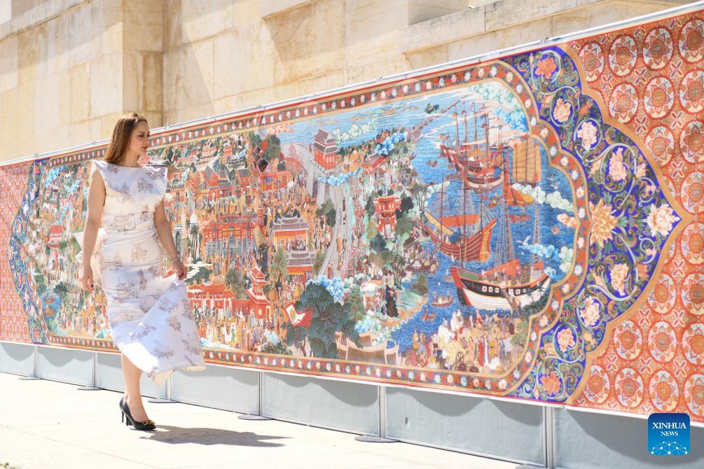 A model walks past the Maritime Silk Road-themed Thangka painting World Emporium, wearing fashion outfits inspired by intangible cultural heritage from Licheng District of Quanzhou of southeast China's Fujian Province, at the Palais des Nations in Geneva, Switzerland, April 17, 2026. A celebration marking the 2026 United Nations Chinese Language Day was held on Friday. The event drew some 400 participants, notably officials from international organizations and diplomats from over 30 countries such as Georgia, Laos, Mexico, Pakistan, Thailand, Uzbekistan, and Vietnam. (Xinhua/Lian Yi)