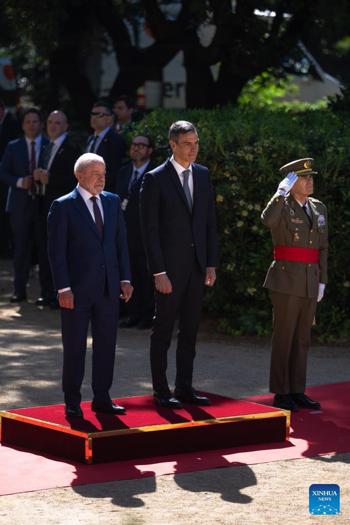 Spanish Prime Minister Pedro Sanchez (R in podium) holds a welcome ceremony for Brazilian President Luiz Inacio Lula da Silva (L in podium) in Barcelona, Spain, April 17, 2026. They held a bilateral summit Friday. (Photo by Joan Gosa/Xinhua)