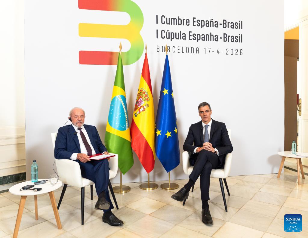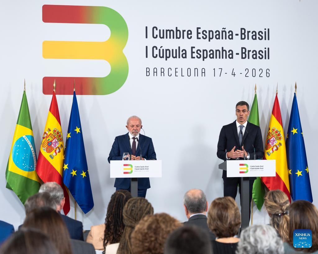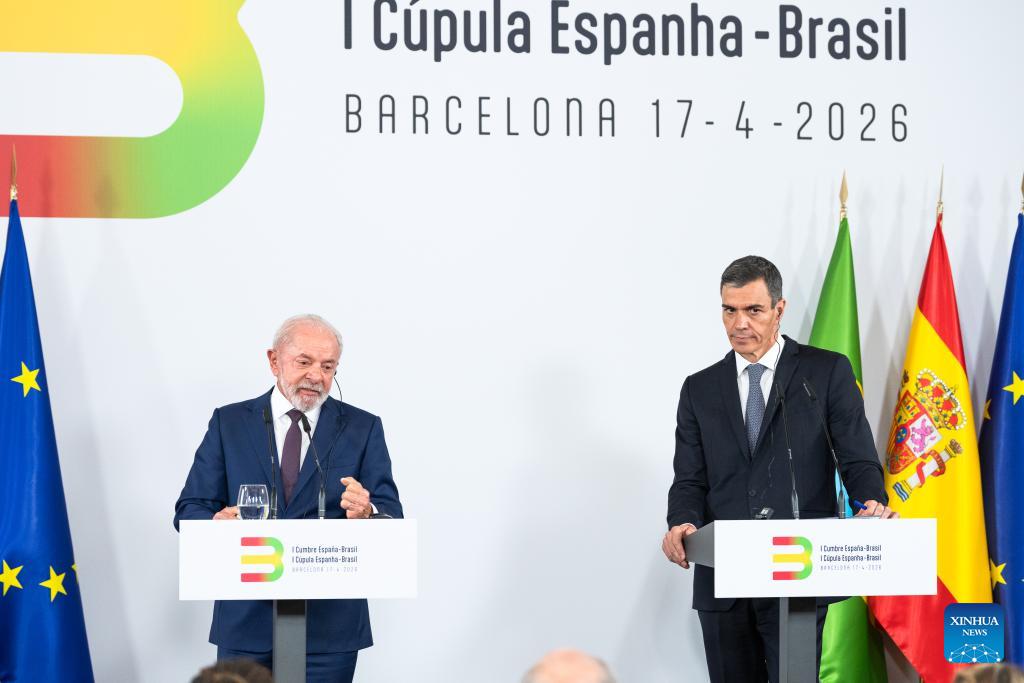 Spanish Prime Minister Pedro Sanchez (R) and Brazilian President Luiz Inacio Lula da Silva attend the press conference in Barcelona, Spain, April 17, 2026. They held a bilateral summit Friday. (Photo by Joan Gosa/Xinhua)