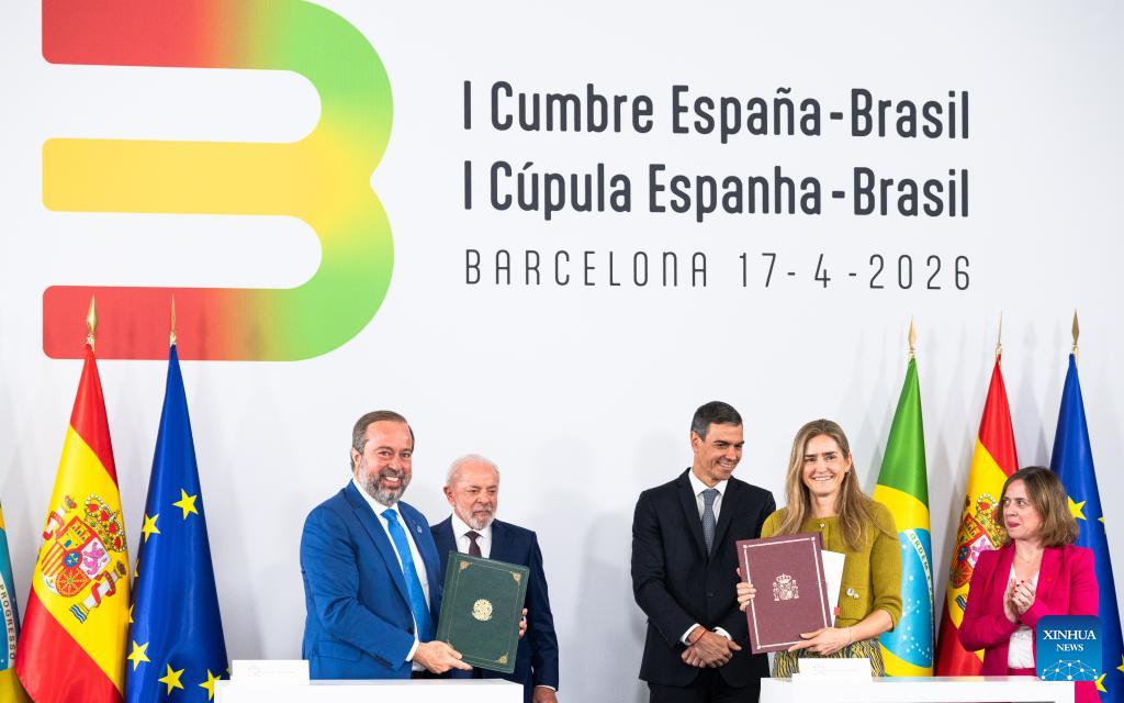 Spanish Prime Minister Pedro Sanchez (3rd L) and Brazilian President Luiz Inacio Lula da Silva (2nd L) attend a signing ceremony for the agreements in Barcelona, Spain, April 17, 2026. They held a bilateral summit Friday. (Photo by Joan Gosa/Xinhua)