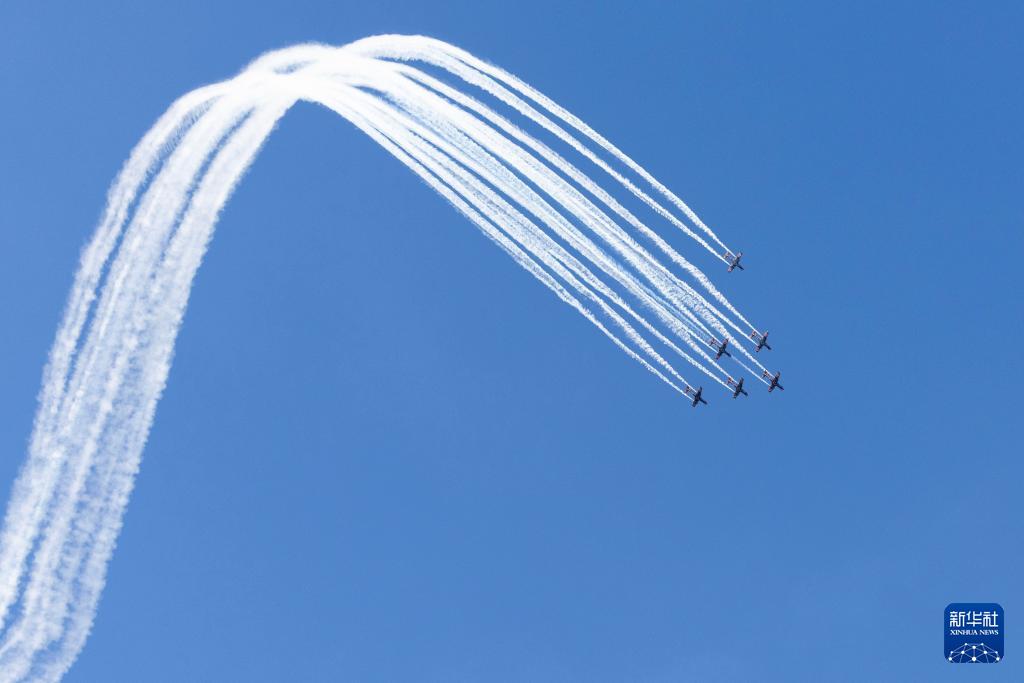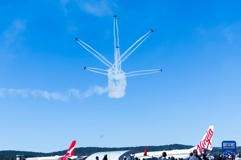 The Royal Australian Air Force (RAAF) Roulettes aerobatic display team performs during the Canberra Airport Open Day in Canberra, Australia, April 18, 2026. (Photo by Chu Chen/Xinhua)