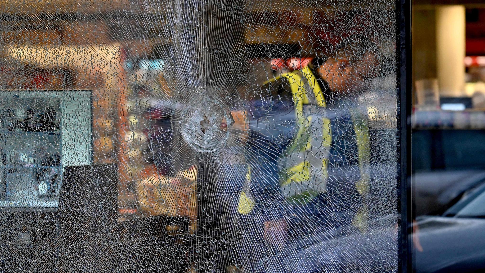 A policeman walks past a bullet hole in the window of a supermarket after a shooting in Kyiv on April 18, 2026. (Photo: VCG)