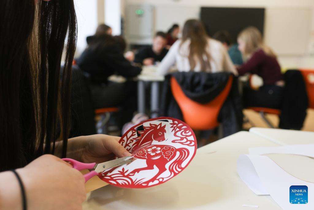 Students participate in a paper-cutting workshop during an event marking the International Chinese Language Day at a high school in Celje, Slovenia, April 20, 2026. (Photo by Zeljko Stevanic/Xinhua)
