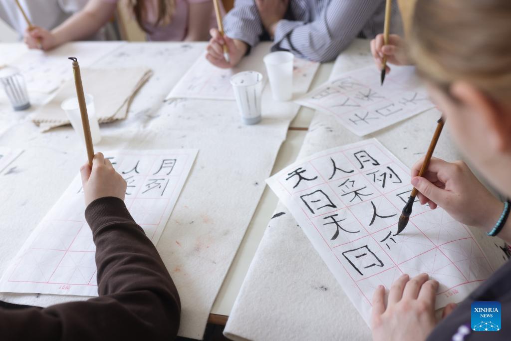 Students participate in a Chinese calligraphy workshop during an event marking the International Chinese Language Day at a high school in Celje, Slovenia, April 20, 2026. (Photo by Zeljko Stevanic/Xinhua)