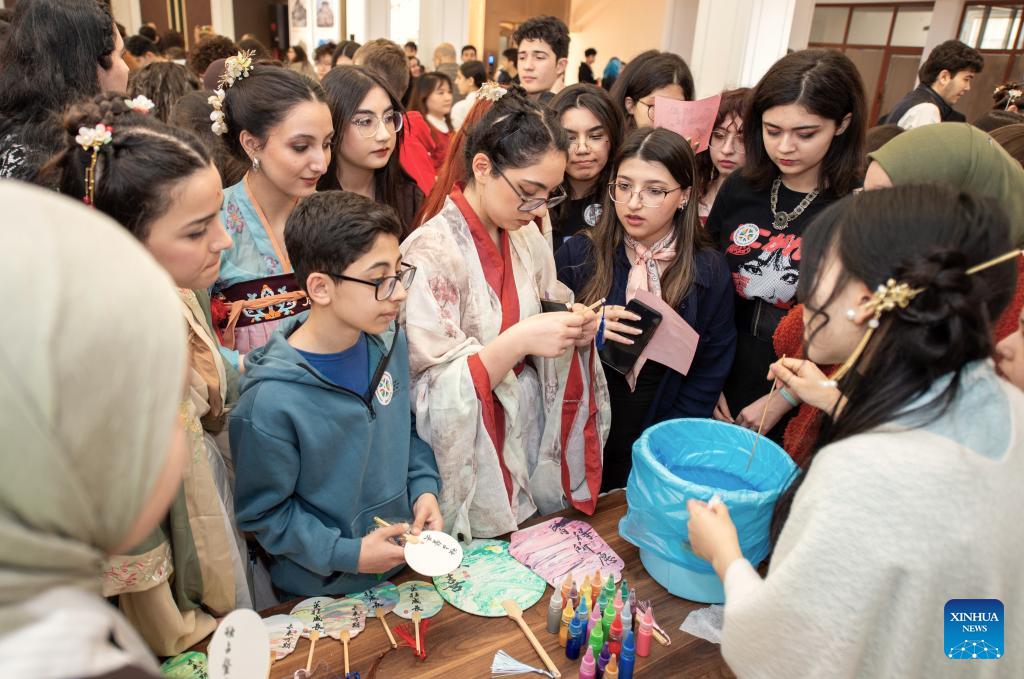 Participants experience the making of traditional Chinese round fans during an event marking the International Chinese Language Day in Baku, Azerbaijan, April 20, 2026. (Xinhua/Chen Junfeng)