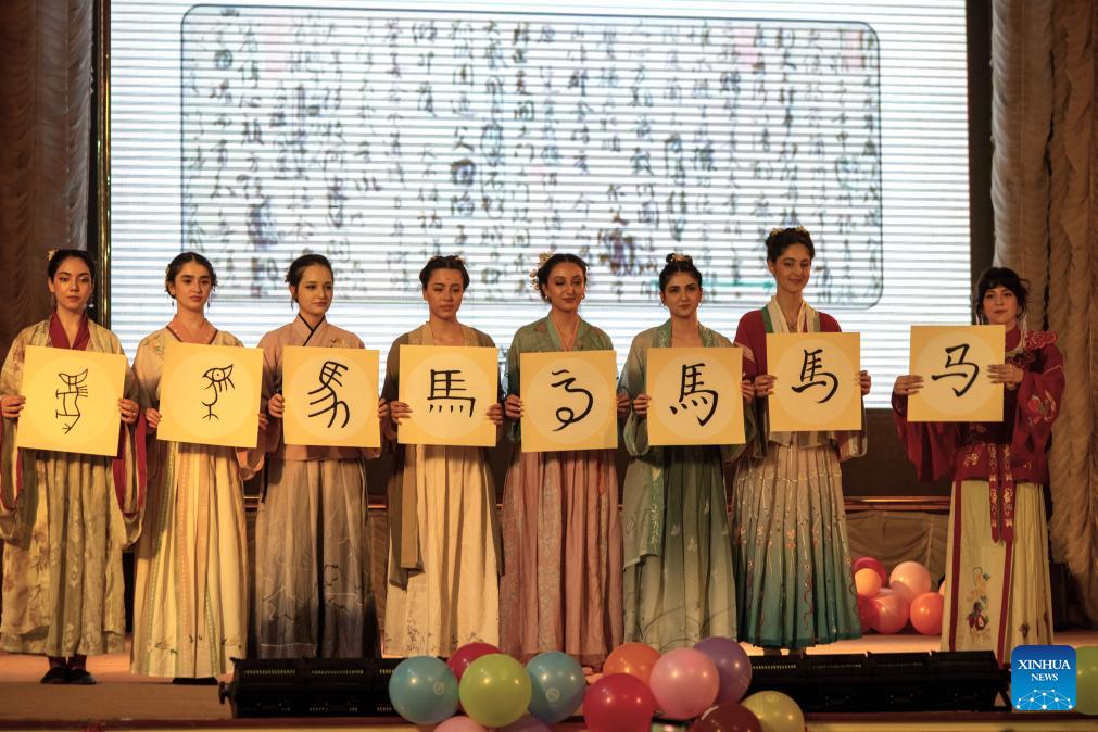 Students from the Confucius Institute at Baku State University introduce the evolution of the Chinese character Ma, which means "horse," during an event marking the International Chinese Language Day in Baku, Azerbaijan, April 20, 2026. (Xinhua/Chen Junfeng)