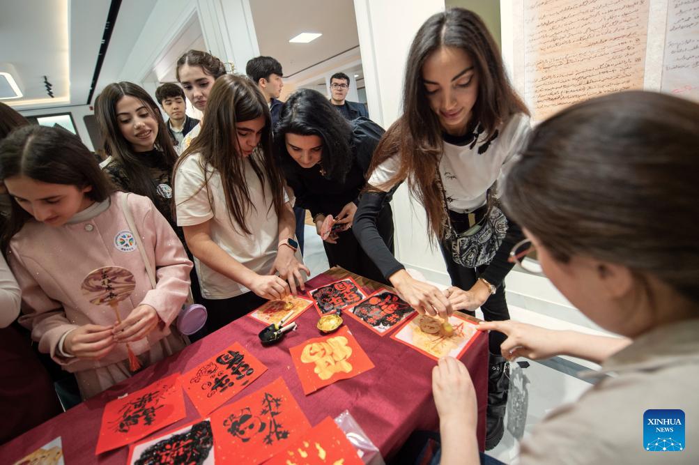 Participants experience traditional Chinese rubbing art during an event marking the International Chinese Language Day in Baku, Azerbaijan, April 20, 2026. (Xinhua/Chen Junfeng)