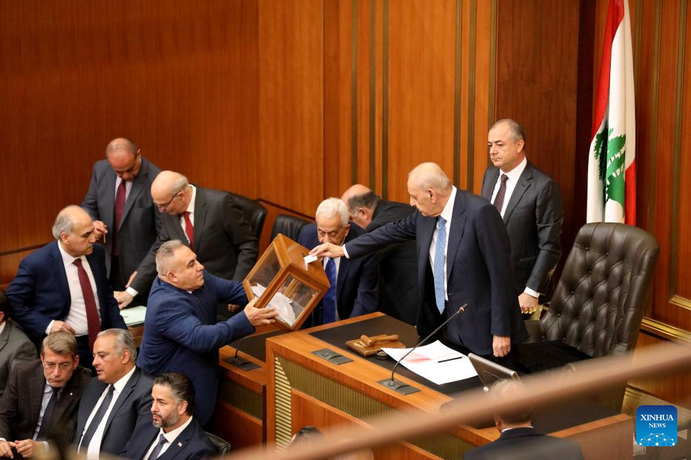 Lebanese Parliament Speaker Nabih Berri (2nd R) casts his ballot during an electoral session in Beirut, Lebanon, Jan. 9, 2024. Lebanon's army chief Joseph Aoun was elected president in the second round of the presidential vote held on Thursday. (Xinhua/Bilal Jawich)