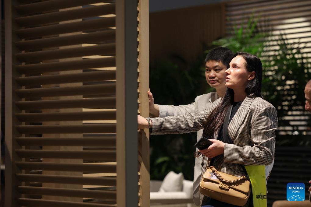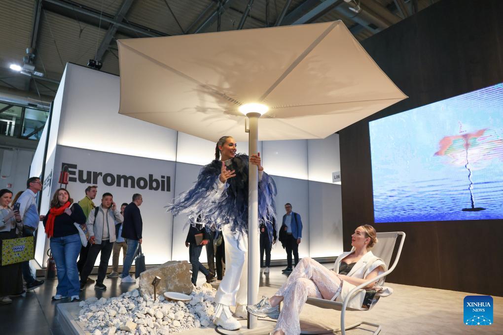 People watch an outdoor design by Yardcom and SAOTA during the 64th Salone del Mobile at Fiera Milano Rho exhibition center in Milan, Italy, April 22, 2026. The 64th Salone del Mobile, an international furniture and design industry event, is held here from April 21 to 26. (Xinhua/Li Jing)
