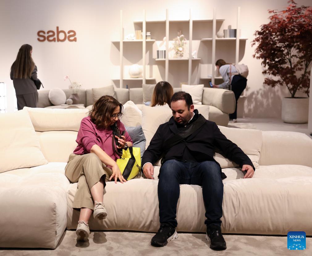 People try out a sofa during the 64th Salone del Mobile at Fiera Milano Rho exhibition center in Milan, Italy, April 22, 2026. The 64th Salone del Mobile, an international furniture and design industry event, is held here from April 21 to 26. (Xinhua/Li Jing)
