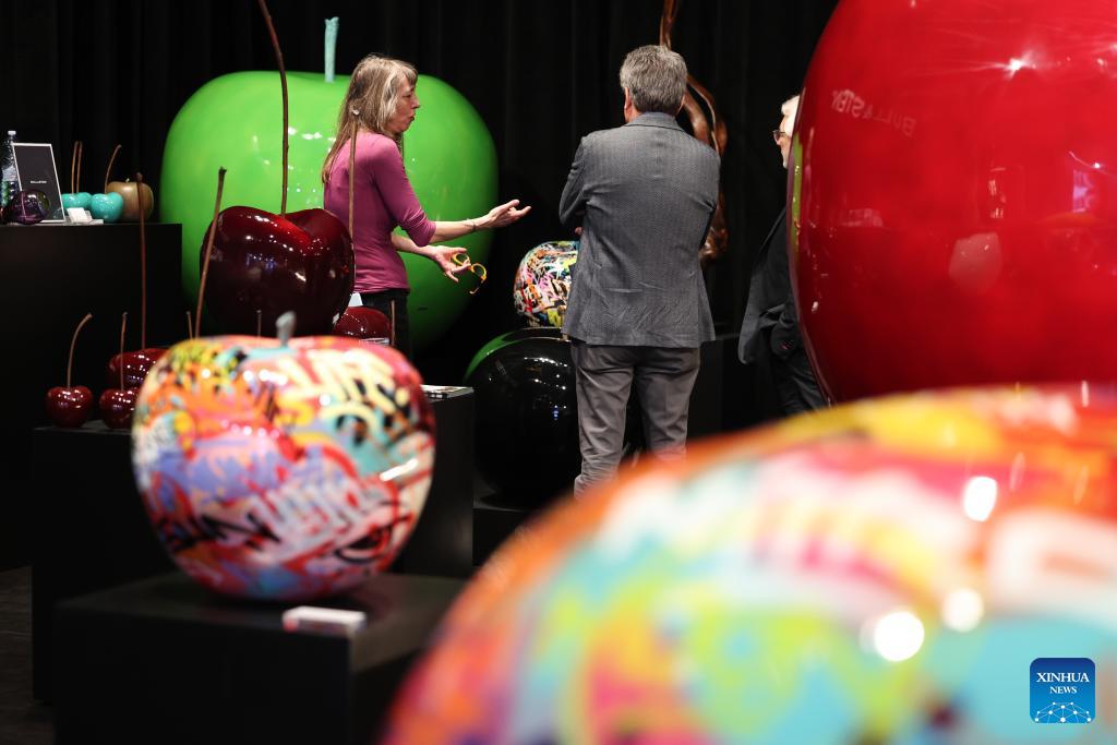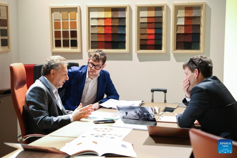 Exhibitors communicate during the 64th Salone del Mobile at Fiera Milano Rho exhibition center in Milan, Italy, April 22, 2026. The 64th Salone del Mobile, an international furniture and design industry event, is held here from April 21 to 26. (Xinhua/Li Jing)