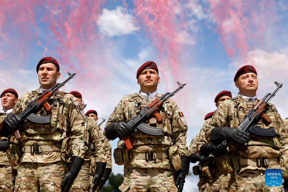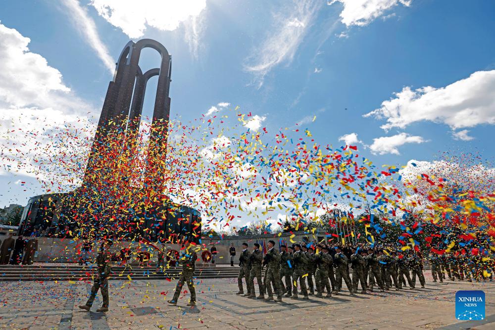 Soldiers march in front of the Tomb of Unknown Soldier during a ceremony marking Romania's Land Forces Day in Bucharest, Romania, April 23, 2026. (Photo by Cristian Cristel/Xinhua)
