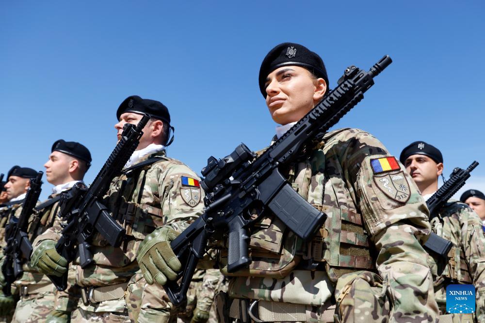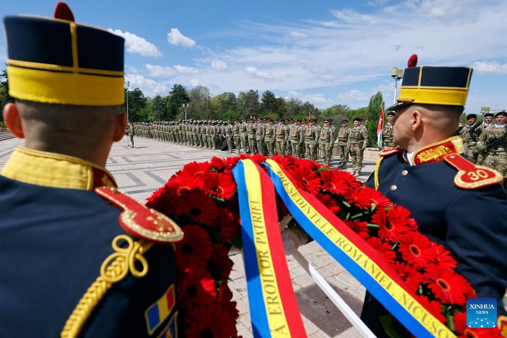 Soldiers attend a ceremony marking Romania's Land Forces Day at the Tomb of Unknown Soldier in Bucharest, Romania, April 23, 2026. (Photo by Cristian Cristel/Xinhua)